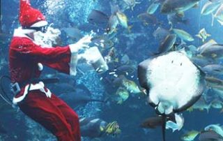 サンタクロースが餌付けショー始めます! サンタクロースの餌付けショー 日本でも珍しい 入り江に浮かんだ水族船「アクアドームペリー号」の大水槽では、ダイバーがサンタクロースの衣装を着て魚の餌付けショーを行います。サンタクロースにプレゼントされた餌をついばむ魚たち、特に、大きなエイやマイワシ1万匹が餌に乱舞する様は、ダイバーを覆うほどです。 また、ショー終了後には、水槽越しにサンタダイバーを記念撮影できるお時間もございます。 【期間】平成30年11月23日(金)~12月25日(火)まで 1日1回 10:35~ 12月24日と25日は1日2回 10:35~、14:35~